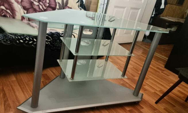 Szklany stolik RTV w dobrym stanie. Posiada dwie półki ze szkła hartowanego, które są wytrzymałe i odporne na ...